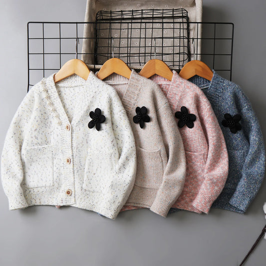2024 New Fashion Children's Cardigan Girl Beading V-neck Cotton Cashmere Sweaters Coat Spring Autumn Kids Wool Knitted Jacket