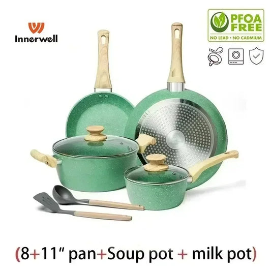 Innerwell 8+11inch Frying Pan Stew Pot Milk Pot Sets Nonstick Nontoxic Cookware Kitchen Stir Fry Cooking Pot Suitable All Stoves