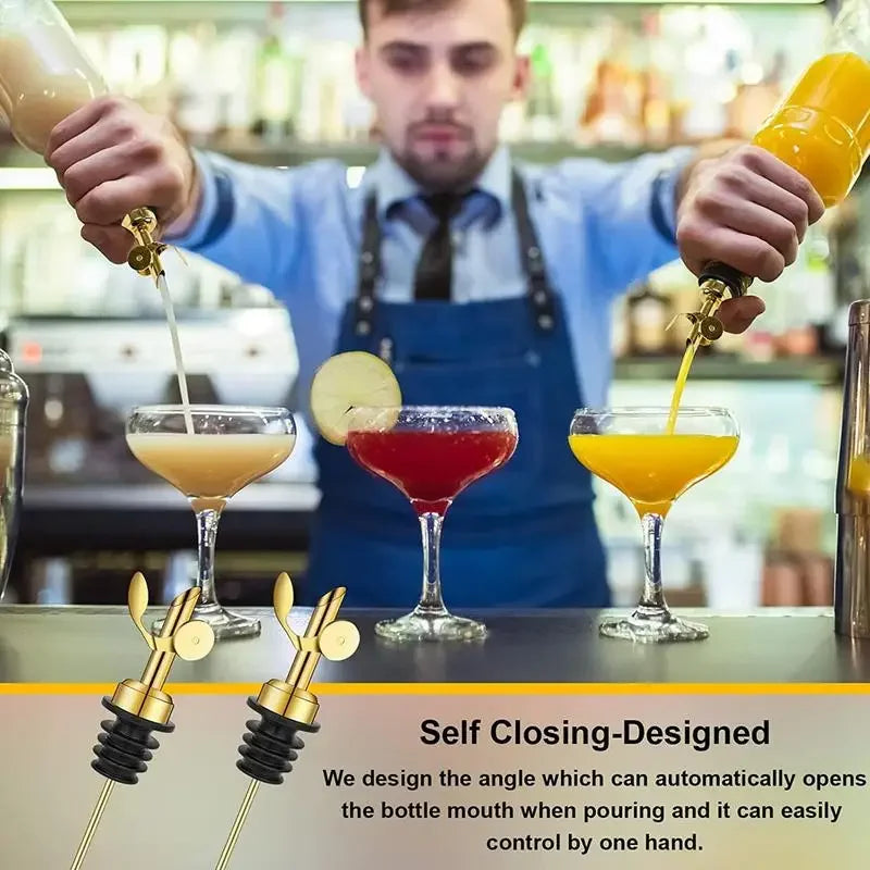 1,Self-closing design: Our weighted bottle pourers close automatically when the bottle is held upright, preventing spills and leaks. They are also designed for 1-handed control, allowing you to pour with precision and ease.