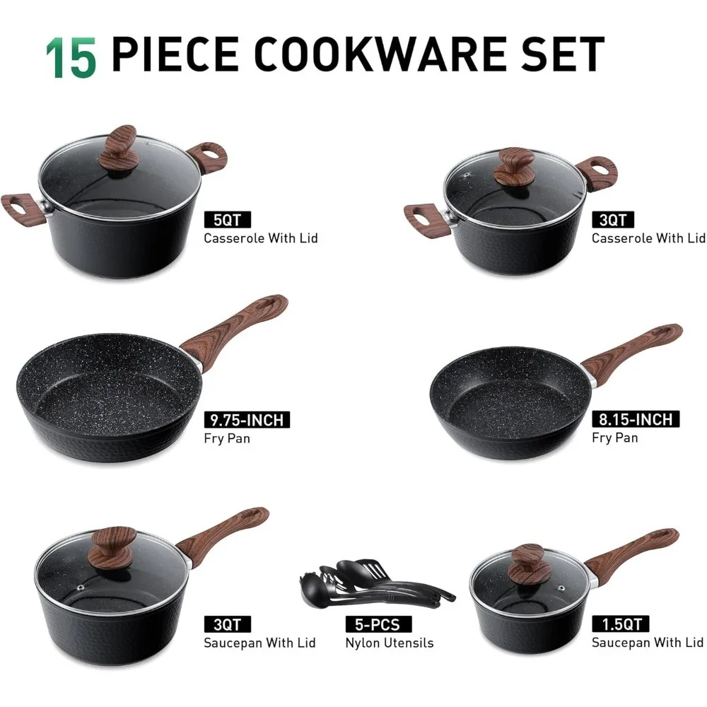 Clearance on Pots and Pans Set Non Stick, 15 Pcs Non Toxic Hammered Cookware Set, Black Granite Induction Kitchen Cooking Sets